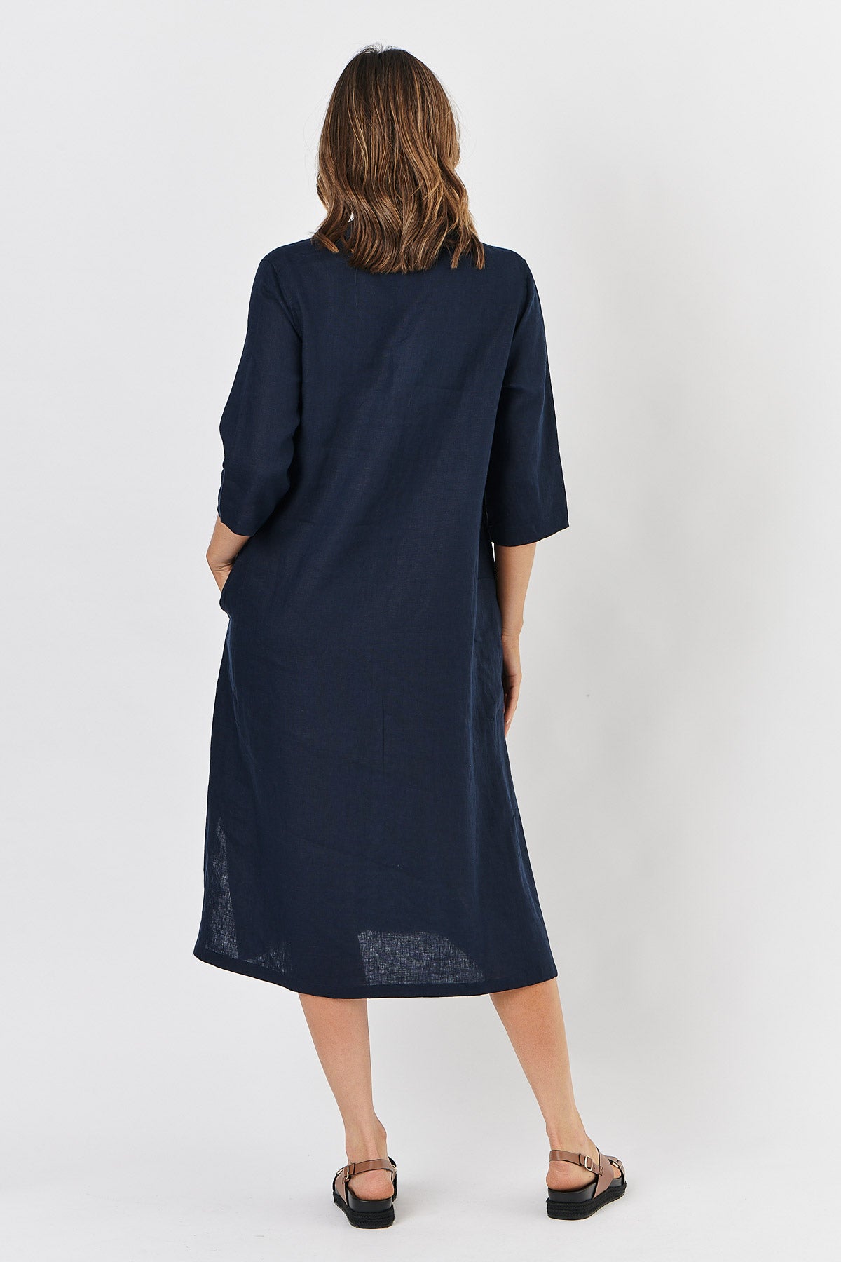 Inspired by the look of your favourite, ultra-comfortable shirt, this dress is a linen midi dress with a point collar,
