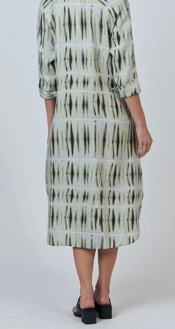 Take your favourite linen shirt and turn it into a midi dress. GA417 features a soft point collar, buttons all the way down, and a slit cuff that falls midway down the forearm. Made from 100% linen, with a subtle high-low hem, this dress can easily be taken from day into evening.