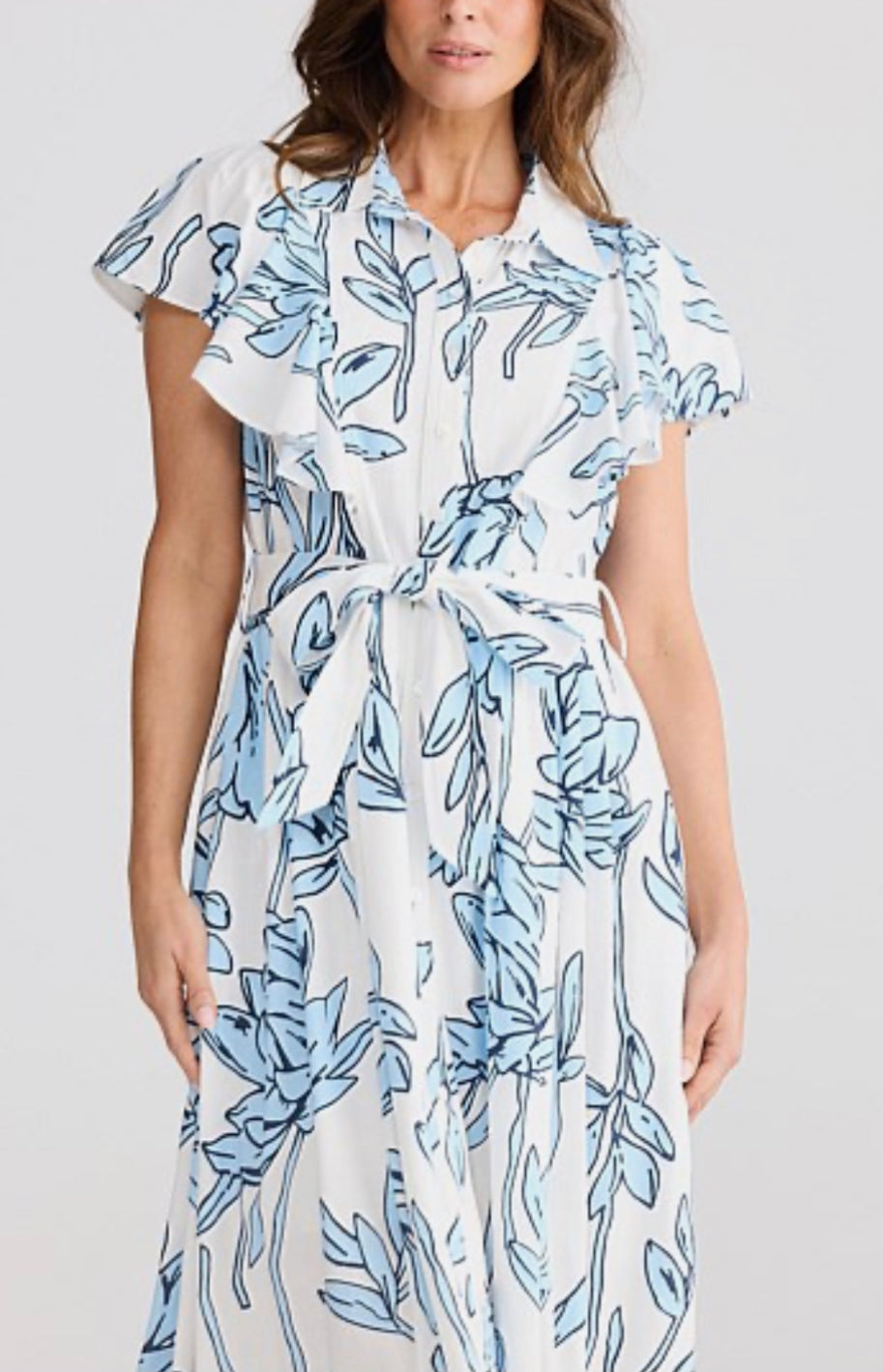 The Marigold Dress in Coastal Bloom showcases a classic shirt collar with a button placket and features delicate frills that extend over the shoulders and along the princess seams. It is designed with side seam pockets, a removable waist tie, and falls to a midi length for a refined look.